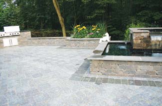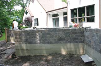 The hardscape for the patio is Unilock Stonehenge laid on a bedding course of torpedo sand. The wall is Quarrystone with lilac bluestone coping.