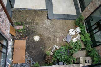 This tiny city courtyard is bounded on all sides by the building. The walkway is composed of black and white granite, with Mexican pond pebbles for the path.