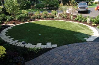 The man eating euonymus groundcover strikes again. Acres of euonymus were torn out of this front yard. The client wanted shrubs and perennials and no lawn. Carol Heffernan decided to establish a ?EUR??,,????'??sense of order in a field of plants?EUR??,,????'?? by designing a small, circular lawn area surrounded by an edge of uneven slabs of limestone drywall to draw attention to the garden. ?EUR??,,????'??I wanted stone with a fairly thick depth, and some uniformity to the pieces, yet with a bit of irregularity to give sort of a rustic crenellation to the shape,?EUR??,,????'?? explains Ms. Heffernan. The longer stones are full pieces of drywall; the shorter ones were scored and broken to give a rough edge. ?EUR??,,????'??Plants were arranged in a hierarchy around the circular focal point to draw the eye away from the neighbors,?EUR??,,????'?? she adds.