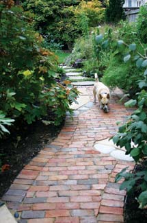 This rustic walk through the garden in a small city side yard was used by the former owners as a dog run. The objective, says Carol Heffernan, was to ?EUR??,,????'??evoke the feeling of a little winding stream.?EUR??,,????'?? Newly manufactured Phoenix brick is flashed and irregular. ?EUR??,,????'??We cut it with a hand chisel to keep a rough look to fit around the larger stones,?EUR??,,????'?? notes Carol. Large Sandy Creek flagstone and river flats accents the river rocks at the edge of a stream. The plants are Hydrangea quercifolia; Spirea salicifolia; willow leaf spirea; Viburnum 'Juddii'; and Galium odoratum.