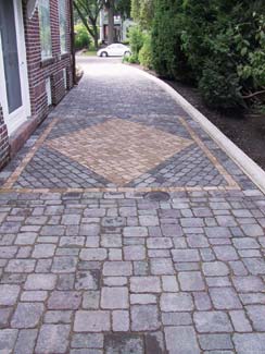 A driveway of Unilock Brussels Block with a pattern set delineates the side entrance of the house. A poured concrete curb contains the slightly higher elevation of the opposite side. The pavers are in two standard sizes, full-stone (6 3/8" x 8 1/4") and half-stone (6 3/4" x 4 1/8"). The stones were cut where one pattern meets another.