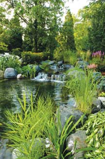 Two meandering streams, which start at the same point, split into two water courses, cascading over a combined total of 75?EUR??,,????'??? before returning to the main pond. The streams are not only pleasing to the eyes and ears but help maintain water quality. The water courses are heavily planted with aquatics which ultimately remove many of the nutrients in the water and achieve an overall balance in the water. The cause of an algae bloom is often the result of excessive nutrients in the water. The use of aquatic plants assists in removing these nutrients and suppressing algae. The plantings also bring a natural appearance to the stone shoreline.