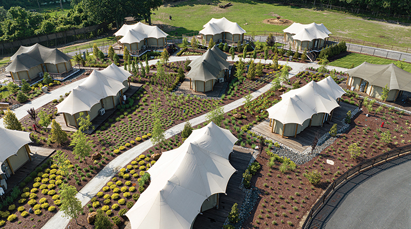 In the theme park world, attractions come and go based on what's trending to participation levels to just plain-old aging out. An "immersive experience" used to mean walking through a living habitat; today it's often a headset and a soundtrack. At Six Flags Great Adventure in Jackson, New Jersey, the goal wasn't to replace the 350-acre Wild Safari - home to roaming herds of giraffe, antelope, and other species - so much as help people feel the thrill of it all again: quietly, up close, and overnight.In late 2023, safari director and lead veterinarian Dr. William "Doc" Rives reached out to Senior principal Richard Maloney at Colliers Engineering & Design and assembled a team. The landscape architecture concept - led by senior Landscape Architect Zachary Rohde, PLA, and discipline leader Christopher Gammons, PLA, LLA, ASLA - set the direction: let guests sleep inside the park and wake to the first light rolling across the grasslands. Maloney and Doc had worked together before, but this was unlike anything they'd ever tackled, with nine months to proceed from initial concept to open doors and happy campers. "This wasn't just another project - it was a race against time that I didn't think was possible," Maloney recalls. "But the team said it could be done."From Vision to First LightThe resort reuses a previously developed camp inside the safari, keeping the footprint light and the large trees standing. Existing service corridors carried much of the load; new work was sized to what the place actually needed. From there, the plan organized itself around views - an approach led by Rohde and Gammons, who positioned each tent for proper sightlines. Some tents angled west to catch the evening glow, others turned toward the small commotion of morning when the herds begin to stir. Tent footprints were adjusted to preserve the views, and structural engineers refined the foundations and anchorage. The decks are raised just enough for sightlines and drainage while paths stay legible and simple, branching off to fire circles and quiet places to take it all in.The rooms were sourced from Bushtec Safari Tents in South Africa - made of canvas and timber, with long horizons instead of fuss. Their assemblies use a four-layer roof: a protective shade-net flysheet for UV and debris protection, a PVC rain flysheet, the vendor's proprietary South African canvas - specified as double-layered and insulated for comfort - and a bull-denim cotton ceiling liner that elevates the interior feel. The doors were fabricated in a Mexican factory to accommodate the required, larger electronic lock specifications. Outdoor seating was crafted in African teak by a firm in Victoria Falls, Zimbabwe, with additional custom furniture fabricated in Mexico. All this was brought together to provide comfort without stealing focus from the savannah just beyond the rail.