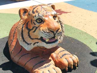 The Bengal tiger, just one of the creatures the Swiss Family Robinson had to deal with on their fanciful island, attempts to climb out of the pit. The poured-in-place rubber surfacing is by Sport Surface Specialties.