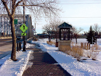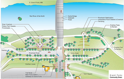 In response, the river landscape adjacent to downtown Grand Forks will include a Community Green near the Sorlie Bridge linked to the Town Square behind the new levee. The Community Green is the primary gathering place on the river for Grand Forks. It contains a park and gazebo donated by the local Rotary Club, an obelisk and overlook that interprets the history of flooding on the river and access through the flood protection system that creates a gateway to the city.