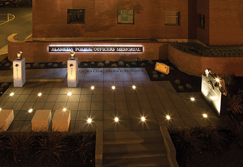 The design of Gates + Associates of San Ramon, Calif., for the Alameda Police Officers' Memorial included a short, picturesque walking path bordered by draught tolerant landscaping that leads to a memorial garden plaza with granite benches, a commemorative plaque, cut-metal signage and sand blasted concrete with the maxim "In Valor There is Hope." The bronze busts of the officers are by artist Lawrence Noble, and sit atop granite columns. LEDs were incorporated into the concrete paving and also illuminate the signage. Cold Spring Granite and Associated Lighting Representatives provided materials at cost.