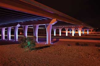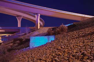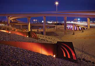 Lighting is a key component of the overall composition of the landscape. The design includes wash lighting on gabion walls, up-lighting of trees and bridge columns and internal and back-lighting of art features. Color punctuates key view-sheds within the interchange, creating focal points with bursts of light. The lighting also reinforces the sense of movement and dynamic quality of the bridge structures and landscape.