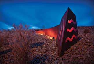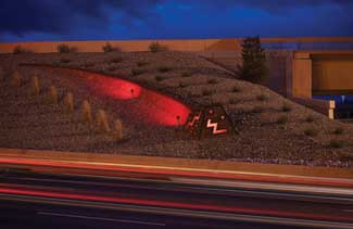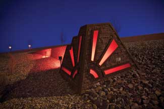 The lighting on the tail of the stone ?EUR??,,????'??sweep and pylon?EUR??,,????'?? is directed to produce a ?EUR??,,????'??hot?EUR??,,????'?? spot with fading intensity. These features occur in groups of three, spaced to allow clear recognition of the forms at highway speed. The pylons are oriented to be viewed from both east-bound and west-bound traffic. The dynamic effect evokes a sense of movement, exploding and dissipating along the inside of the sweep. The pylons are internally lit, glowing through plexiglass cut-outs in the stone.