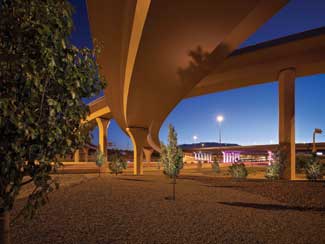 "The Big I?EUR??,,????'?? is the popular name for the I-25 and I-40 interchange. This 100-acre setting near downtown Albuquerque is the most visible landscape in the state. The design celebrates the forms, rhythms, materials and cultural imagery distinctive to New Mexicans. The landscape makes an indelible impression on locals and cross-country travelers alike. With widespread visibility and huge physical presence, the Big I was the perfect opportunity to implement comprehensive sustainable practices.