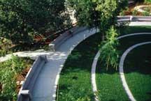 Since the opening of the Walter A. Buehler Alumni Visitor Center, it has proven to be a very successful and popular location for special events on campus. Located on the south side of the UC Davis campus, the 1.5 acre site is prominently situated along Mrak Hall Drive at Old Davis Road, across from the UC Davis Arboretum to the north and the Center for the Performing Arts to the west. The two-level building can be viewed from Interstate 80. The Alumni Visitor Center was designed to be a focus for visitor and alumni events and administration. The genesis of the project was to create a permanent home for the Cal Aggie Alumni Association. A second project goal was to create a ?EUR??,,????'??Front Door of the Campus?EUR??,,????'??, where visitors could arrive, be greeted and then toured through the campus. The landscape site plan features a variety of outdoor gathering areas, including an arboretum walk. The heart of the site plan is a large hardscape and circular grass plaza, to the north of the building, designed as a setting for special events and informal gatherings. A long, continuous curving wall, of cast in place colored concrete, encloses the area providing seating for multiple groups or individual users. A curvilinear garden walk along the eastern edge of the site, was designed to be a teaching resource and creates an arboretum connection from the Alumni Visitor Center to the University Arboretum at Putah Creek. Prior to the development of the project, an impressive collection of plant species had been planted on the site and was being used, by the Environmental Horticultural Department, as teaching specimens. The existing trees from the Environmental Horticulture collection were preserved and incorporated into the design of the arboretum walk. The curvilinear path alignment allows the visitor to view each specimen tree in a focused spatial context. To further enhance the campus horticultural teaching collection, and consistent with the UC Davis theme of ?EUR??,,????'??Campus as Arboretum,?EUR??,,????'?? the planting design and species selection were carefully collaborated with the University Arboretum. The color palette of blue and gold, a tribute to the University and the Cal Aggie Alumni Association, was used in the plant material selection. Bicycle transportation and parking is very important at UC Davis. The main building entry, located on the south facade, features a continuous arcade. Bike parking was developed as an extension of the arcade system. This location for the bike parking is conveniently equidistant from the main building entry and the beginning of the arboretum garden walk. From this point, it is possible for pedestrians to explore the arboretum walk, passing among the teaching collection of ornamental trees with under story plantings of blue and gold, proceed into the central open space of the Visitor Center, then continue along the arboretum walk to the University Arboretum. Firm's Role: Antonia Bava Landscape Architects provided site and landscape design and documentation including: site planning, grading, landscape construction, hardscape, and softscape areas. Work included schematic design through construction observation.