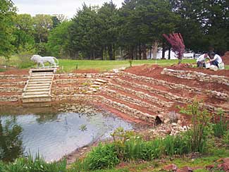 This residence in Guthrie, Oklahoma was backed up by a golf course on which the developer had created six dams across a couple of streams in order to create six ponds. The house was on one of the sites with a pond and a dam. When the waterfall was already completed, the owners called in Sam Rice. The front of the property ran for 14 feet across the top of one of the dams, and the 40 percent grade down to the pond was steep and needed to be managed to control runoff and soil erosion. It was decided that a terraced set of dry stacked stone walls would not only control soil erosion, but would also enhance the property.