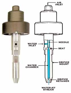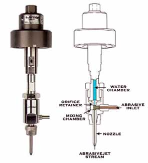 Waterjet pressures are usually developed through a two-step pump. Initially hydraulic fluid is brought to a conventional high pressure of about 3000 psi; in a special intensifier cylinder, the hydraulic pressure is then converted at 20:1 ratio into water pressure of 60,000 psi. As one might imagine, the plumbing, joining and valving components are highly specialized for containing the flow of such fluids.