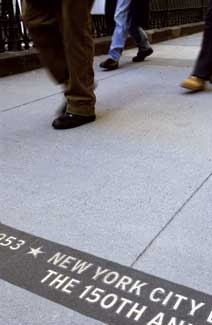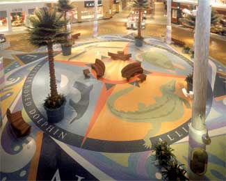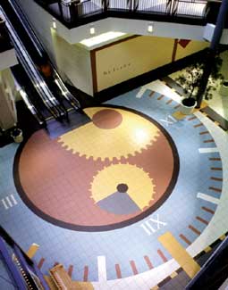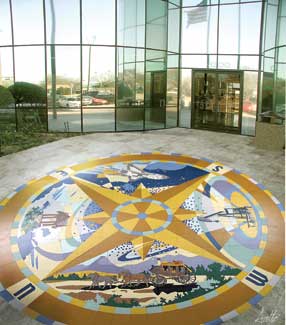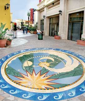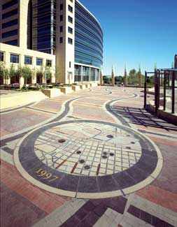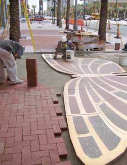 In recent years a variety of precast agglomerate products have become available. These pavers, in 18 by 18-inch to 36 by 36-inch grids, can be factory fabricated with contrasting colors and textures, preassembled and installed on site to make large colorful patterns. Some of these pre-cast materials gain their color from the chips used in the mixture; others feature colorfast high temperature pigments directly in the matrix. All such pre-cast pavers: concrete, rustic terrazzo or cementitious terrazzo are ideal for a grid based waterjet pattern.