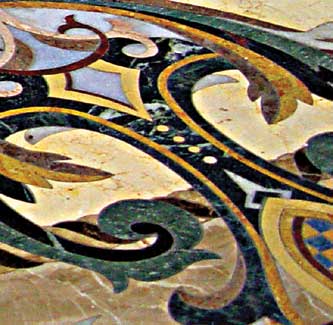In general higher quality projects with larger format slabs and sheets of material will use irregular patterns. The joints are planned to work with the shapes in the image and are part of the design not apart from it. Note: The complex medallion whose 1200 pieces are sub-assembled into 62 interlocking shapes.