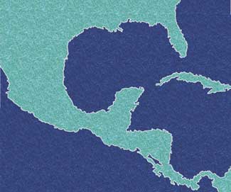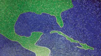 Colored agglomerates are often poured into bent metal divider frames to make letters, logos, maps or artistic patterns. Where detail is intense or the exact shape is important, the waterjet can be used to cut the divider frame, on its x-y table. The result is an exact reproduction of a coastline, for example the Caribbean area shown at left.