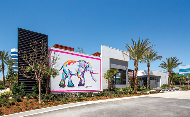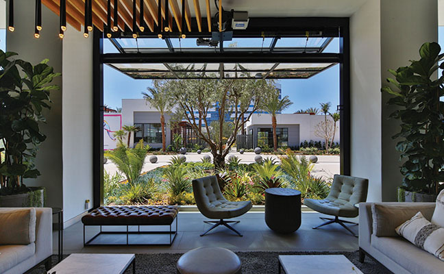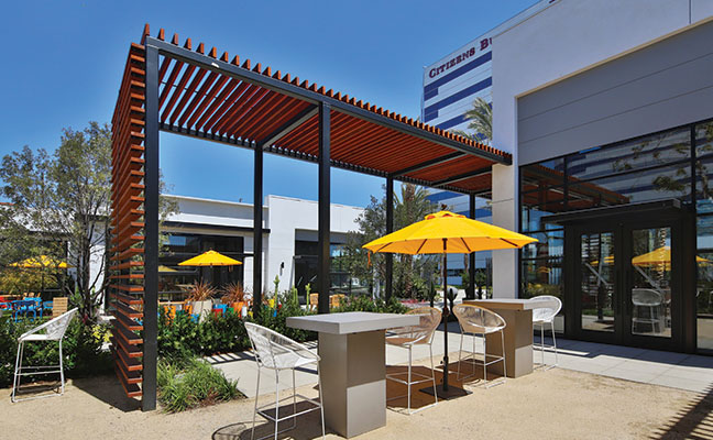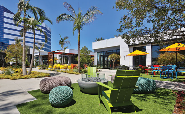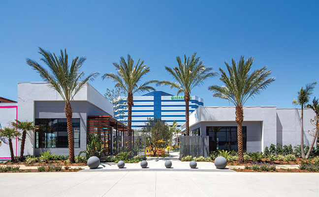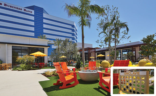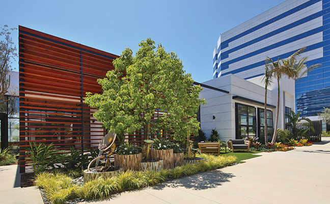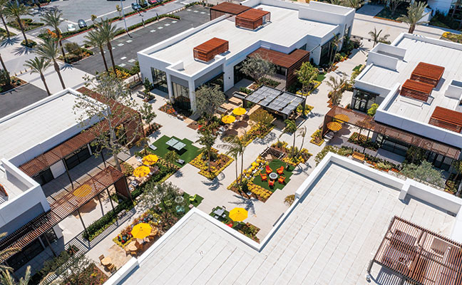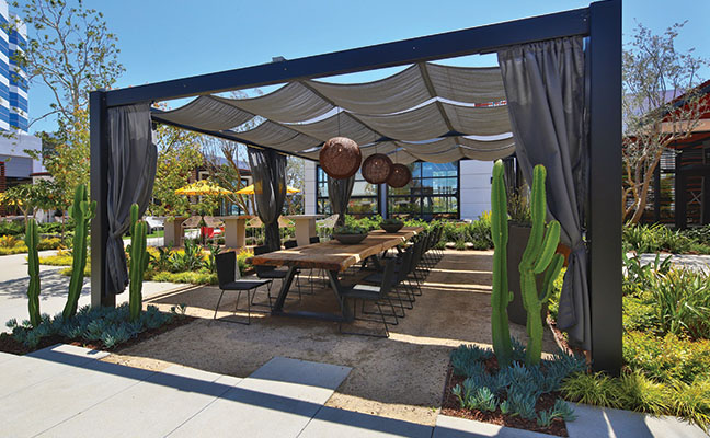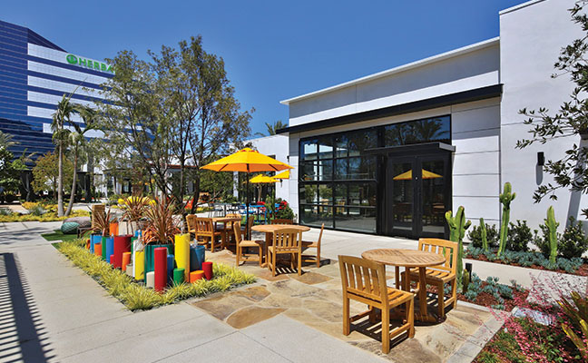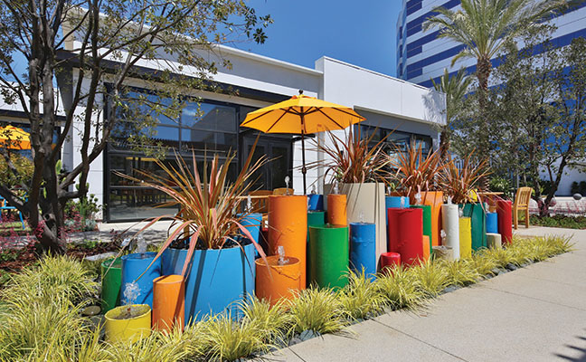 The South Bay region of Los Angeles is so named because it contains the southernmost portion of the Santa Monica Bay, which forms the western boundary of the metro area. Newly introduced to this region is The Enclave, a 2.5-acre site in a corporate campus between two towers with 500,000 square feet of newly renovated A-class office space. When Lifescapes International started to conceive of the landscape architecture for this project, they focused on giving tenants and guests an escape from the outdated concept of plain, mundane office environments and, at the same time, give local residents a sense of community. The results are new, hip and fresh - a break from the expected. For example, chef-driven restaurants and local culture were all curated to drive creativity and innovation. The Structures To provide food and beverage retail and social offerings to the nearby office tenants, as well as the surrounding community, approximately 25,000 square feet of buildings were designed and constructed, which now house carefully selected chef-focused restaurants that offer an array of options from casual dining, coffee shop and bar alternatives as a draw. The architecture by 5+ Design encourages outdoor use. Since the pandemic was at the forefront of everyone's mind when designing the project, flexibility was critical. The landscape architecture had to complement the indoor/outdoor environment. In the food and beverage retail space, fresh air patios spill out of the restaurants. It was also essential to work functional and collaborative workspaces into the design of the retail area. The architecture includes large, folding barn doors in the restaurants which allow dining areas to spill out to patios for indoor/outdoor experiences. In the nearby office tower buildings, the main lobbies now have retractable walls with garden exposure. This provides fresh air and views of the newly added colorful gardens that appear to be spilling out from inside. Crassula ripple jade, Agave americana 'Mediopicta Alba' (Century Plant), Kalanchoe Blossfeldiana (Tiger yellow), sedum coppertone, and White Striped Tasman Flax Lily provide the layered carpet for the towering olive tree in the center of the gardens. At the Heart of the Center There are many entrance points to the restaurant retail center. Guests entering the plaza are greeted by an array of native plant materials and majestic Medjool date palms and the outside walls are lined with colorful murals, but the courtyard is where the action takes place. Twenty-five thousand square feet of outdoor collaborative work and social space with ample seating creates "destinations within destinations" for guests and nearby employees. Two organic orchards and herb gardens are located alongside the office buildings, offering seating among citrus trees and herb planters. Tenants can enjoy a fresh orange on their lunch break and take in the sweet-smelling fragrance of the fruit tree.