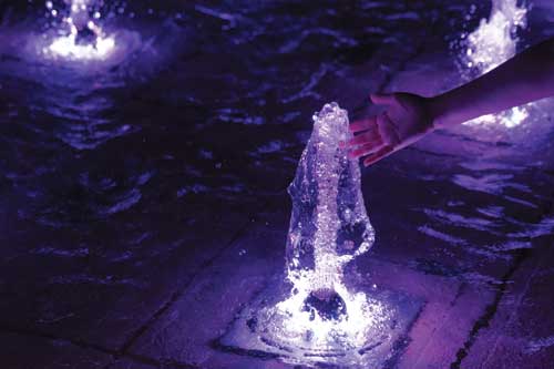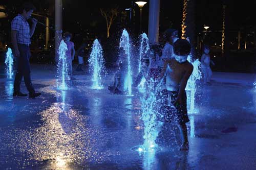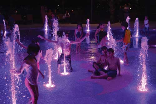 The Children's Garden Water Fountain is a splash pad with flush-mounted sequencing nozzles with column effects, tied to 36 color changing LEDs.
