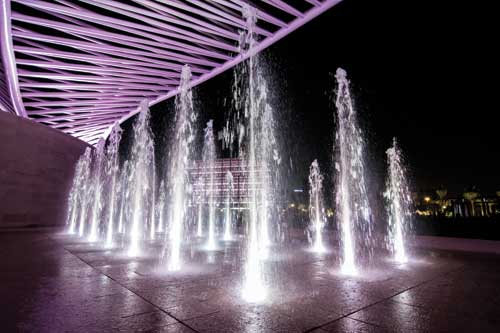 Other fountains encourage the public's interaction. A vast oval shaped green space sits between the memorial gardens and an interactive amphitheater water feature in which the public is encouraged to play. Streams of water shoot up from 21-flush mounted nozzles, creating different water shows that provide a visual attraction and a cooling effect for those relaxing in the adjoining green space. The amphitheater feature also functions as an innovative dual use fountain that can be turned off to provide space for performances. It can seamlessly change from a water feature to a theatrical stage where up to 2,500 people can enjoy shows from the surrounding stands or nearby field.