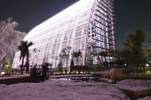 The Botanic Garden pool is a series of natural pools bordered by sandstone slabs quarried in Oman. Metal fish were embedded in the rock of the manmade streams running through Mushrif Park, and rocky steps in the water have been filed down to remove all sharp edges. The 28-meter tall Shade House (right) is an open-air atrium of 30 species of tropical plants and palms. The structure blocks about 50 percent of the intense Abu Dhabi sun, without which the plants would not typically survive. A fogging system helps maintain humidity levels to support plant growth. A second-story viewing level inside the structure looks out onto the Great Lawn and amphitheater.
