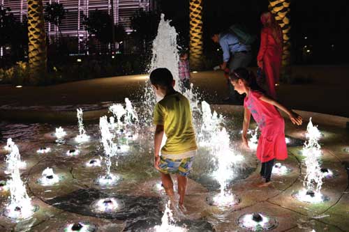 This is particularly noticeable at night when the water features are illuminated by hundreds of multicolored submersible LED lights. The promenade water feature is the largest in the park, extending 420 meters across it. Two large channels comprise its most prominent design feature and contain a series of step cascades and aerated nozzles. Pedestrian paths and extensive landscaping also run alongside the fountains, enabling the promenade to form the spine of the park. Individual water features also enhance the architecture of the park's wider spaces and distinctive gardens. An array of different water features creates a range of diverse water experiences for the public to enjoy. Contemporary fountains display modern designs and effects, but are balanced with natural water features that encourage the growth of vegetation and plant life. Some fountain pools evolve from elegant, traditional water features, to dynamic displays of sequenced water and light, whereas interactive fountains encourage the public to directly engage with the water.