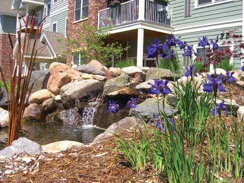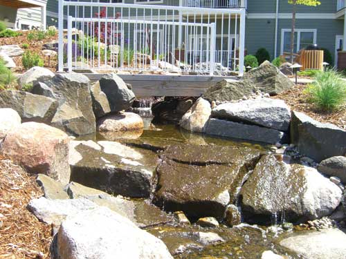 To expand on the idea of improving water quality, the landscape architect designed a stream and waterfall along one end of the pond. The Aquascape snorkel vault with two ?EUR??,,????'??centipede?EUR??,,????'?? modules pump water from the main pond to create a cascading waterfall over rocks. The water flows through a streambed beneath a pedestrian bridge on the trail, then back into the pond. The sights and sounds of the stream have become very popular with the residents.