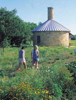 A grouping of pavilions beckons visitors from the parking area. Sitting on the upper edge of the hillside, the pavilion site was chosen for its full view over the preserve and across to the neighboring hill. One of the trail bridges across the creek is visible from the overlook. The forms recall the agricultural heritage of the region and the feeling is one of complete removal from the suburban surroundings. Designed by Larson & Pedigo Architects of Dallas, the structures are named after native tree species and are constructed of Leuders Limestone and steel. Leuders was chosen for its durability and resemblance to the Austin Chalk stone existing on site. The three structures are open to the public, but may also be rented individually or together, providing facilities for various groups within the community. The pavilions are lit by incandescent rafter lights that throw light up toward the high ceilings. The effect is a warm glow reflected down and out of the structure, similar to the nighttime view of a farmhouse out on the prairie when viewed from afar. Nearby is the restroom facility. Formed in the image of an old granary, the unique building is distinctive and can be seen from the road. The imagery of these structures makes one proud to be Texan.