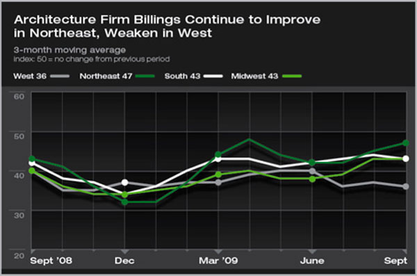 Business conditions remain weak in all regions of the country, with firms in the West reporting the slowest conditions for the third month in a row. While a higher share of firms in the Northeast are reporting improving billings than they did several months ago, the score remains below 50. This indicates that firms with declining billings still outweigh those reporting improving billings.