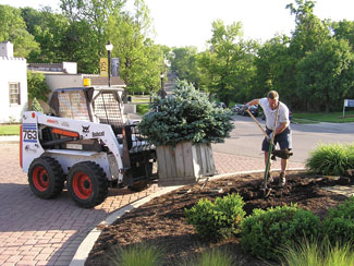 In spring a slow release fertilizer and pre-emergent goes into the flower beds. Mulching the beds is ongoing, using a double-shredded black platinum or black gold mulch delivered in bulk to the campus.