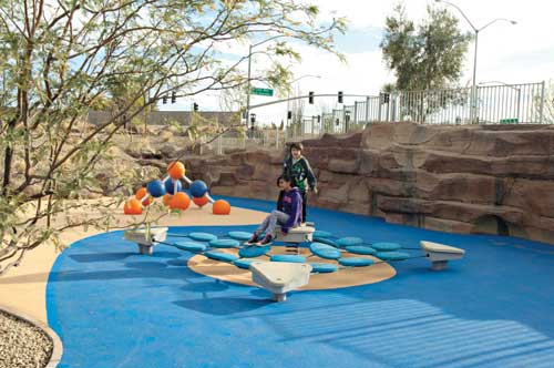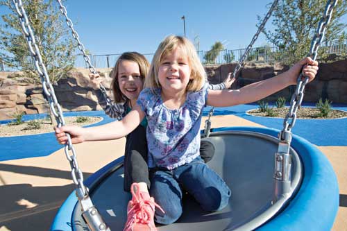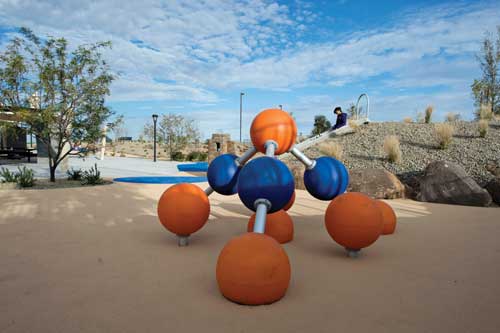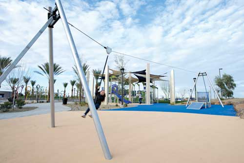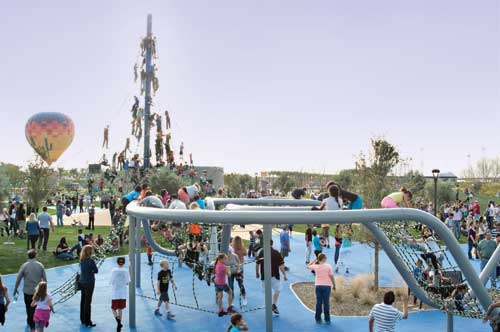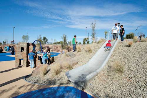 More Play Options Not all the climbing on the playground is done via ropes. There's a 300-ft. glass fiber reinforced concrete (GFRC) wall tucked into the hillside to give kids a different climbing experience. There are two traditional playground clusters with slides, one for ages 2-5, the other for the 6-12 group. Among the play pieces on site are "Ball Pods', a climber that replicates the atomic design when different elements attach to one another; a circular "Spinning Machine'; a balance-enhancing "Surfy' stepper; a dish-like swing that accommodates up to four kids; and one of the hottest new additions to playgrounds: a 70-foot zip-line. Water to Fish and Splash, with Amenities Among the new amenities residents can now enjoy in Riverview Park is a reconfigured and larger fishing lake. The five-acre Riverview Lake draws urban anglers to visit the boardwalk or the fishing coves and cast a line. There is a splashpad with multiple water features"?ua must for this climate; a display fountain; shaded ramadas with tables; open play areas; large restrooms; an observation hill; and acres of green hills and landscaping.