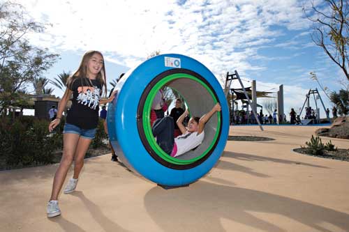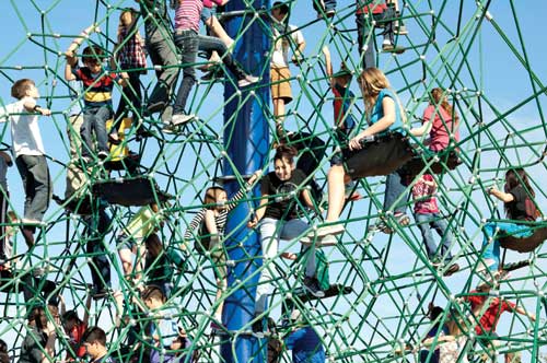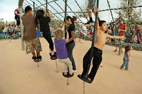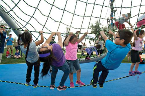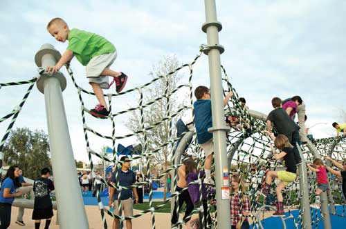 We Need "Spectacular' Mesa Parks really wanted the new playground to stand out, to present kids with something special and spectacular, not just your commonplace playground. Feeling that what the playground needed was a tall net climber, Andrea Moore of Mesa Parks & Rec contacted Rob Lockhart, CCPI, CPS, of Dynamo Industries, a playground manufacturer out of Rockland, Ontario, Canada that specializes in net climbers. Rob Lockhart relates many people believe net climbers, or what he calls pyramid nets, were invented in German, but says he's done his research and discovered the climbers were first developed in the U.S. in the late 1930s and early 1940s.