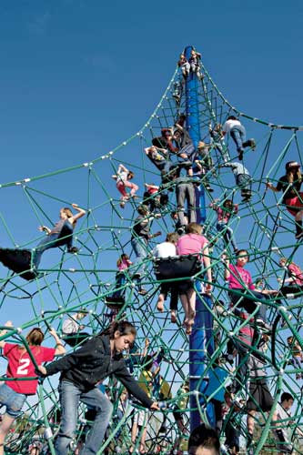 The 60-foot long mesh "ropes course" is 10,000 sq. ft. of undulating, S-shaped climbing fun that the designers began calling the "green monster," although it turned out not to be that hue, except for stripping in the cabling. Some call it the Caterpillar, but whatever you call it, the designers think of it as the wave of the future in climbers. The "UltraFlex' safety surfacing (FlexGround) was installed in two layers: a cushion layer of shredded, recycled tires bonded with urethane, with a half-inch-thick colorized EPDM rubber and urethane wear-course layer atop. Both layers were mixed on site and hand-troweled into place. The base prep was Type II ABC aggregate compressed to a 95 percent compaction rate by vibrating compactors. Photos courtesy of Dynamo