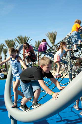The new pyramid climber in Riverview Park, Mesa, Ariz., can accommodate 250 kids at one time. It tops out at 49.3 feet tall, with a spread of 78-ft., 10 inches, making it the tallest playground pyramid climber in the world, according to Rob Lockhart, CCPI, CPSI, of Dynamo Industries, which fabricated the net climber and rope course in South Korea. Rob was in Korea for a month to make sure the design was right, then spent two and a half weeks in Mesa, Ariz., to oversee the net climber and rope course were properly installed. Dynamo's distributer, AZ Rec, did the installations. The net climber required not only 100 cubic yards (13 truck loads) of concrete for the footers, but subterranean 3.5-inch thick steel turnbuckles. The groundings, Lockhart muses, if tethered to a jumbo jet passenger plane, would keep it from budging.