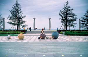 Boy on Planets - Reflecting a playful approach, a neighborhood plaza incorporates a symbolic version of the solar system, with over-scaled planets carved out of solid granite. The planets are linked with narrow stainless steel 'rings' inlaid into the granite flooring to indicate their orbiting paths. Beyond, tall granite columns mark the location of a central neighborhood gathering space overlooking the lake.