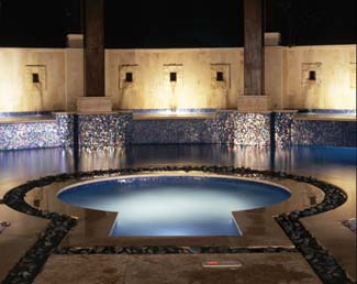 The client wanted to have water used as the primary and major element of the exterior experience. They wanted to use water in large bold sweeps. They wanted the water to make a major visual impact as you entered the house and to serve as a backdrop and focal point for all interior views. Specifically, the client wished for two pools and a spa. The two pools must appear visually connected, but for heating purposes be mechanically separated for differing heating levels. The first, the family pool, was to be heated periodically throughout the year, and was for the use of seasonal guests and family. The second, the master-retreat pool, was to be heated to high daily temperatures and delineated so the owners could swim ?EUR??,,????'??au-natural?EUR??,,????'?? and enjoy privacy from adjacent neighbors and nearby golfers.