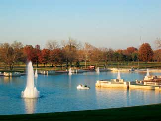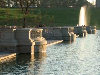 Forest Park once again offers visitors looking across the Grand Basin toward the St. Louis Art Museum a glimpse of what the area looked like long ago. Landscaping and finishing touches are still in progress, but a distinctly classical look is already apparent in the newly completed fountains that now grace the Grand Basin and the elegant Jewel Box.