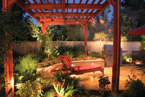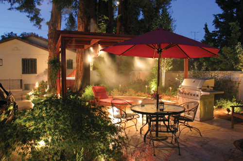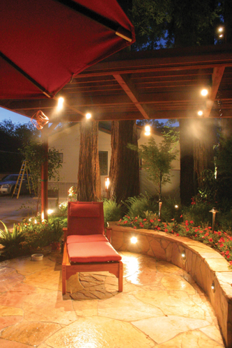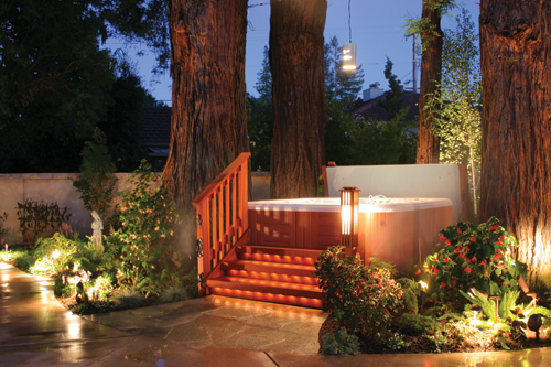 Both the redwoods and the maples were up-lit with low-voltage lighting, while the redwoods feature down-lights to illuminate the spa area. All the lighting is independently controlled and dimmable.