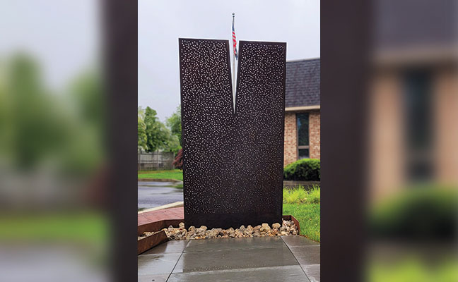 On the 20th Anniversary of the September 11th attacks, the Borough of Barrington dedicated a Memorial Garden in honor and remembrance for those who perished and for the heroic men and women of the rescue and recovery effort. The project involved numerous volunteers and members of the community including the Barrington 9/11 Memorial Committee, Borough Council, Public Works, fire and rescue personnel, and residents as well as a Landscape Architect, civil engineers, and contractors. The Memorial Garden located adjacent to Borough Hall is a peaceful place for respite, healing, and community gathering. The center piece is the Shadow Light Marker, a 1" thick ?,? 3/4 ton weathering steel slab, tilted with a v-channel severed at the top and perforated with nearly 3,000 holes. It is angled facing the morning sun and aligned with the American flag. The slab casts a shadow on the plaza enabling the v-channel to mark the times of the four attacks. Four polished steel blades embedded in the stone plaza mark the exact times of the attacks creating a sharp reflection of light. The 2,977 perforations in the panel represent each person who perished in each of the four attacks. These penetrations are cut at four different angles coinciding with the direct alignment of the sun at the time and the number of victims of each attack.