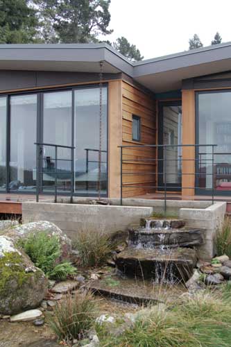 In receiving the rainwater, the lower fountain becomes the heart and lungs of the feature. It is the centerpiece of the redesigned yard space, accentuated by boulders and slabs salvaged from the site. Roth/LaMotte designed the specimen rocks into the fountain?EUR??,,????'???s stream and banks. The source of the water at the lower fountain area is a concrete basin that was integrated into the design of the building addition. It merges with the steps and landscape and contains the water from the roof drain. Roof water descends a chain into a basket of river cobbles that match those of the lower stream. The basket also contains the recirculation element, and water bubbles back up through the basket into the system from the pond below.