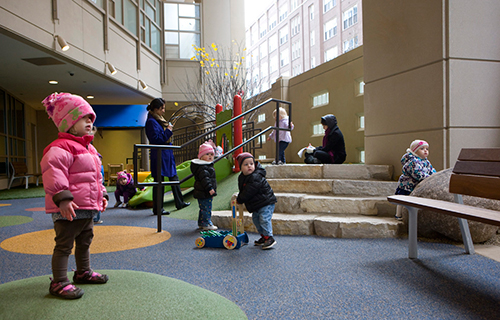 Due to the ever-changing schedules of their staff, Northwestern Memorial Hospital broke ground in 2010 on a new early education center for employees with young children. The new facility was seen as a possible incentive for staff retention and a recruiting tool for future workers. Northwestern partnered with Bright Horizons, a leading provider of employer-sponsored childcare, early education, and work/life solutions. Due to generous donations from the Lavin family, the center now serves many of the families that provide healthcare services in the greater Chicago, Illinois area. Design As part of the design team, Chicago-based firm Hitchcock Design Group was responsible for the design development, schematics, construction documentation and construction administration for the covered play areas, streetscapes and rooftop garden of the Bernice E. Lavin Early Childhood Education Center. To meet day care center outdoor activity space requirements, the roof of the parking garage was transformed into a combination intensive and extensive green roof, which may be further developed into a community garden at a later date. The finished center incorporates nature and imagination-based play with the busy urban bustle of Chicago as a backdrop. Natural elements, including light, water, fresh air, plants and soil are incorporated into the design of the play areas. The spaces are divided into two floors, the first devoted to infants and toddlers, the second to preschoolers. Level One – Toddler Time Within the infant/toddler area, children are able to play in the sand using loose parts, which are materials that can be moved, stacked, carried, taken apart or put together in different ways, allowing them to explore their creative interests. These amenities challenge the toddlers to develop their motor skills, which is crucial at a young age. The space also has a slide, a small seating area and a stage that allows teachers and care providers to gather the children together for group activities or storytelling. In keeping with the center's overall theme of incorporating the elements, natural items like sand, stone, wood, water and plants are placed throughout the space, inviting children to interact and explore the areas. Level Two – Preschool Play On the second floor, partially extending over the play space on the first floor, is a playground designed for preschool age children. Amenities include structured play components and flexible spaces for a wide variety of programming opportunities. A rope on an embankment and an adjacent crawling tunnel provide play opportunities that can stimulate the imagination. Children can also gather and perform in the seating and stage area adjacent to the safety surfaced area. The planters in the play area (Landscape Forms) offer children the opportunity to plant and care for plants, as a supplement to the rooftop garden. The plants were installed in lightweight soil (Hydrotech) and were initially selected for their ability to survive in the play area"s reduced light levels. Hospital officials elected to remove the plants during the winter months, so other plants can be introduced during the spring/summer season. At its grand opening in June 2012, 150 children were already registered to attend the programs at this new facility. The completed early childhood education center is located on the bottom two floors of a facility that also features eleven levels of employee parking and a rooftop garden.