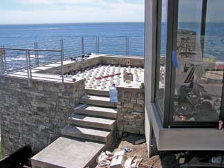 Because the general contractor had already done the rip out, they were able to start with a clean sheet. Working with the building architect, Mike Parker designed a hardscape and softscape plan for the plateau area around the house. It had taken them years to get the approval to do any of the work because the coastal commission, which has jurisdiction on properties that are a certain distance from the mean tide line, gets very involved in any work being done on ocean front properties. The architect did all the preparation for the myriad local ordinances that had to be complied with.