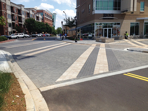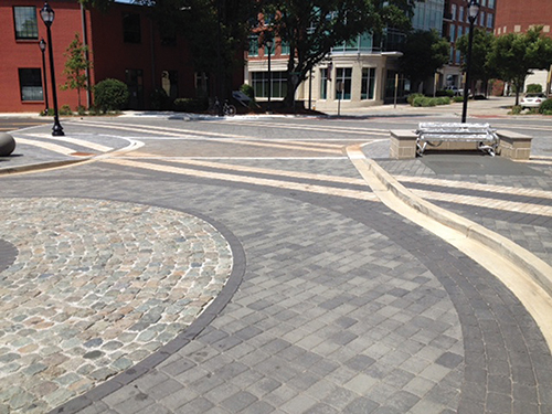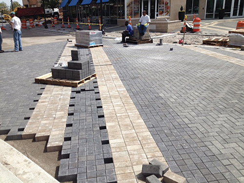 Initial design, load requirements, installation guidelines and product availability were balanced to produce an integrated paver field that met the initial project requirements. The cooperation between the employees and city of Greenville, private installers, public works officials and manufacturing personnel played an important role in meeting the project considerations. Construction The project's construction began with the removal of existing asphalt and excavation to depth for the compacted aggregate, setting bed and pavers. A sub-base of compacted existing site soils was installed, and an eight-inch layer of graded and compacted aggregate was put in place to provide the base for the construction area. Eighty-millimeter pavers (3-1/8") from the Holland, Holland II, City Stone III, City Stone V and Plaza Rectangle series were installed in a bedding of 1 to 1???(R)???AE? inches of angular sand. The street was closed to through-traffic for three weeks during construction in the spring of 2014. Quick work was needed, as offices, shops and public access were all affected during the construction. As many as 15 installers were involved in the deconstruction, excavation and installation of the new pavers. The result is a visually appealing pedestrian boulevard that is also durable enough to withstand heavy traffic loads for decades to come.