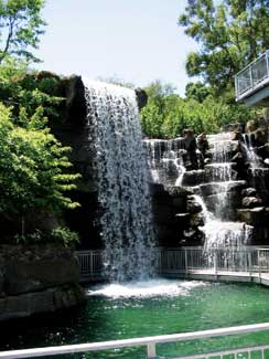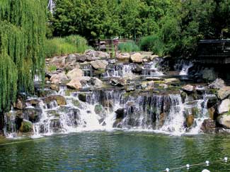 The 30-foot high Bonfante Falls was constructed by Michael Bonfante and two friends with a crane. They set all the rocks in position over one summer. Once built, the waterfall sat for many years. When Alderman Engineering was called in, the three pumps vaults and pumps were already in place. Alderman Engineering modified them, re-sized the diameters in the impellers and built the additional falls and streams the park now features. When the opportunity came to turn the valves on and have the water come flowing out over the rocks it was a very big moment. At the western end of the lake, there are a series of additional waterfalls, while streams and ponds course through the gardens.