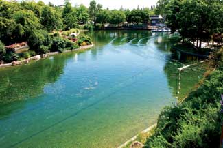 The several lakes, ponds, waterfalls and streams were also engineered by Alderman. Coyote Lake has several amusement rides and is on the same pumping system as Bonfante?EUR??,,????'???s majestic waterfall with 31,000 gallons per minute (GPM) of total flow. A large gravel bed biological filter and aeration/ozonation system keeps the water clear. Alderman also engineered the other ponds, waterfalls and streams.