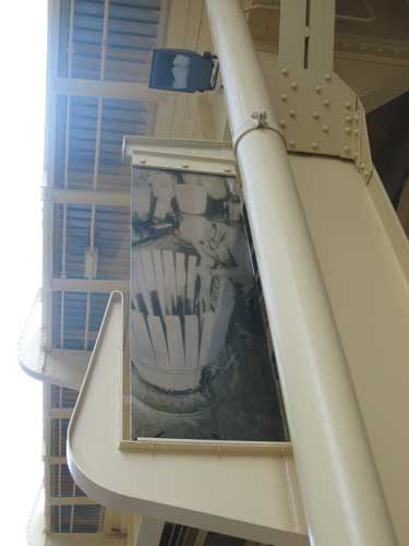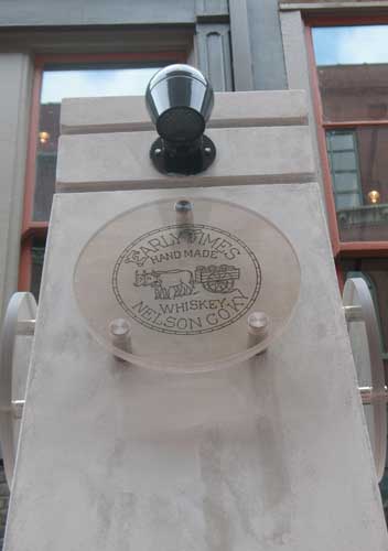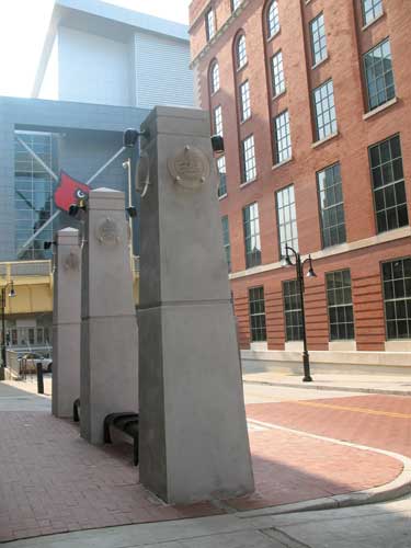 The cast-in-place concrete ???????????(R)?????????(R)?Bourbon???????????(R)?????????(R)? bollards stand 13 ft. 6 inches and have a smooth trowel finish. They replicate mooring piers used on the Ohio River when paddle wheelers transported the barrel-aged distilled whisky in the early 20th century. Digital high-pressure resin-laminated-interpretive panels with a matte finish have historic distillery barrelheads mounted on their faces. The narrow band in the walkway that runs into the center of the bollard is historic granite curbing from the 19th century streets reutilized here as visual clues to the original street alignments.