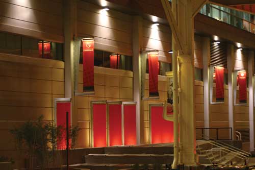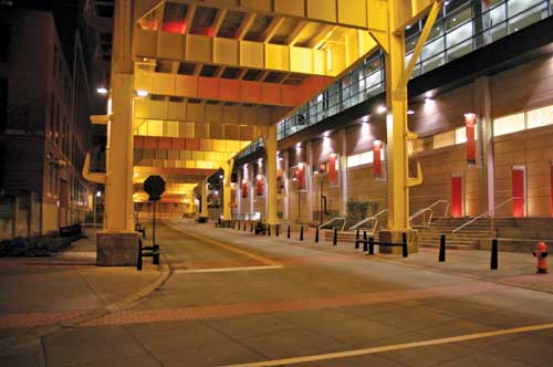 Lighting Patterns The lighting scheme developed for the project is used to provide subtle accent and direct energy to the project. The lighting patterns for the historic bridge are reflective of the massive, muscular structure of the underside of the bridge. The lighting colors were developed in conjunction with the new bridge color (FHWA cream). The bridge color alone has transformed the daytime appearance of the space, while the lighting patterns have enlivened the area below the bridge with complementary red and amber hues. The lighting patterns are revealed in both static and dynamic conditions with programmed sequences designed for special events and hourly ???????????(R)?????????(R)?reminders???????????(R)?????????(R)? of the space.