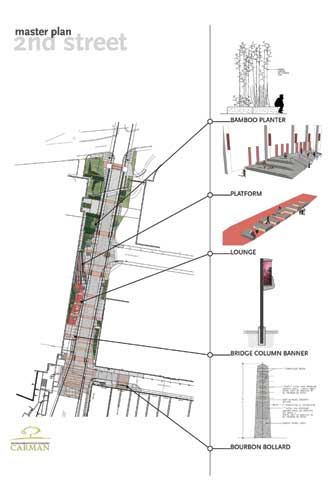 Design Elements CARMAN???????????(R)?????????(R)?s role as landscape architects and engineers was to reveal and emphasize the richly layered landscape of 2nd and Washington streets. The unifying elements for the design are the prevalent bridge columns and the juxtaposition of grids expressed in downtown Louisville. From these organizing patterns emerge spaces and circulation corridors to accommodate a variety of large and small events, users and seasons. The design promotes opportunities for users of the 2nd Street area to observe, gather, converse, celebrate, contemplate, circulate and relax.