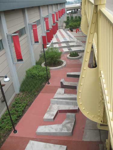From the Clark Memorial Bridge you see the performance/gathering stage and the ottoman lounge room. A special concrete mix gives texture and warmer colors to the paved surfaces. Brick bands (Belden Brick) extend the full width of the corridor and provide a rhythmic pattern. Other hardscape accents are red and black terrazzo bands in the concrete pavement, and ceramic tiles in black and various shades of red for the inside walls of the ottomans. Concrete was specified for the radial seat walls and seating ottomans to withstand the multitudes that will use the space and the city wash downs. Cold tolerant bamboo (Yellow Groove) inside the seat walls is symbolic of the native cane found along waterways and fencerows throughout Kentucky. The light fixtures (selux) have 70-watt metal halide lamps.