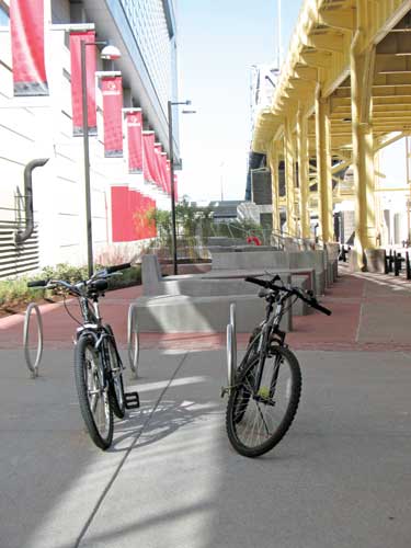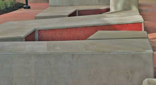 Hardscapes The 2nd Street project, including Washington Street, was designed to accommodate large numbers of people, thus specified materials are durable and sustainable. Brick and concrete are the prevailing hardscape, although patterns, textures and colors have been used to enhance the surfaces for gathering, performing and traveling. A historic concrete mix that gives a texture with a warmer color has been used throughout for all paved surfaces. Brick bands in the pavements provide a rhythmic pattern, extending the full width of the street corridor and are reflective of the bridge structure above. The materials used in the paved areas, landscape objects such as the seat walls and seating ottomans, were selected to withstand the multitudes that will use the space, plus hold up under the utilitarian maintenance and wash downs by the city and arena. Colors were introduced into the hardscape with the exterior use of terrazzo for pavement accents, ceramic tile for wall accents and brick pavement bands to complement the historic brick warehouses and offices.