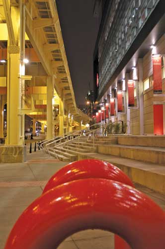 The fluorescent lighting used to complement the structure of the bridge is further enhanced with flashing beacons that are particularly dynamic at a distance. The lighting also provides an additional entertainment feature to the bridge and the space below.