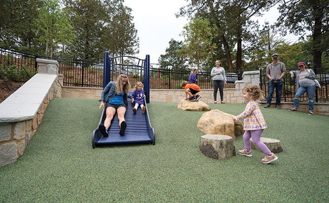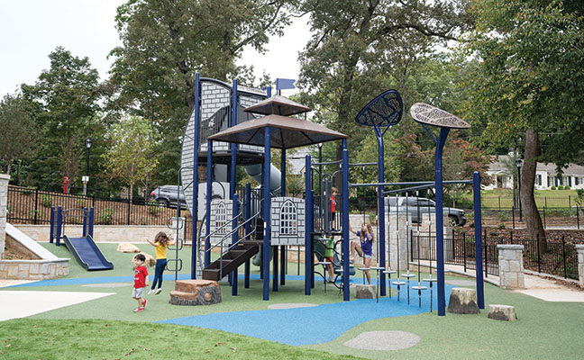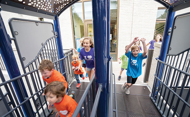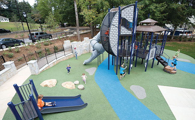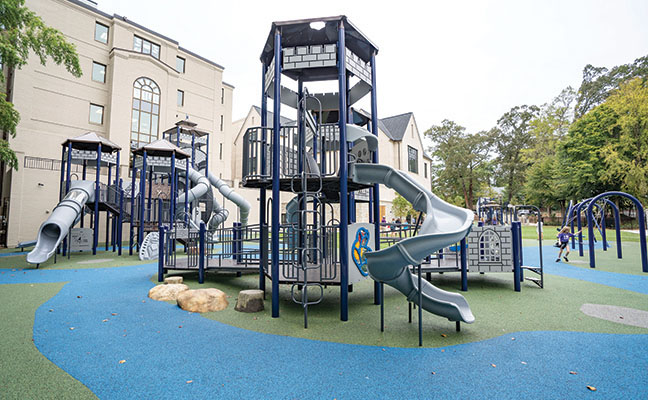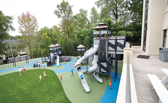 The Pace Academy campus, located in Atlanta, Georgia, is rich in history and dates back to the original building, the "Castle," formerly the private estate of the John Ogden family. Built in 1931, this impressive stone building was built using stone quarried on the property and possesses an architecture that influenced the design of the rest of the campus and grounds. The stately buildings spread throughout the 34-acre campus and combined with beautiful trees, plants, fields, and grass to provide the perfect canvas for the new play environment. Designed to harmonize with the magnificent buildings and embody the feel of a place where the past, present, and future come together to build an atmosphere of excellence, this playground blends form and function to create an imaginative, adventurous, and developmentally rich play experience for all of the Pace students. The design at Pace Academy's playspace is full of exciting surprises and replay value. The towers beg to be climbed again and again with a new and adventurous experience each time. A bridge brought an architect's plans to life and transports children directly from the second floor of the building to the heart of the tower, offering them an opportunity to slide down twisting, turning slides or climb into the main playspace. It also brings them into the playspace faster when it's recess time, making sure they get all of the precious minutes of playtime.
